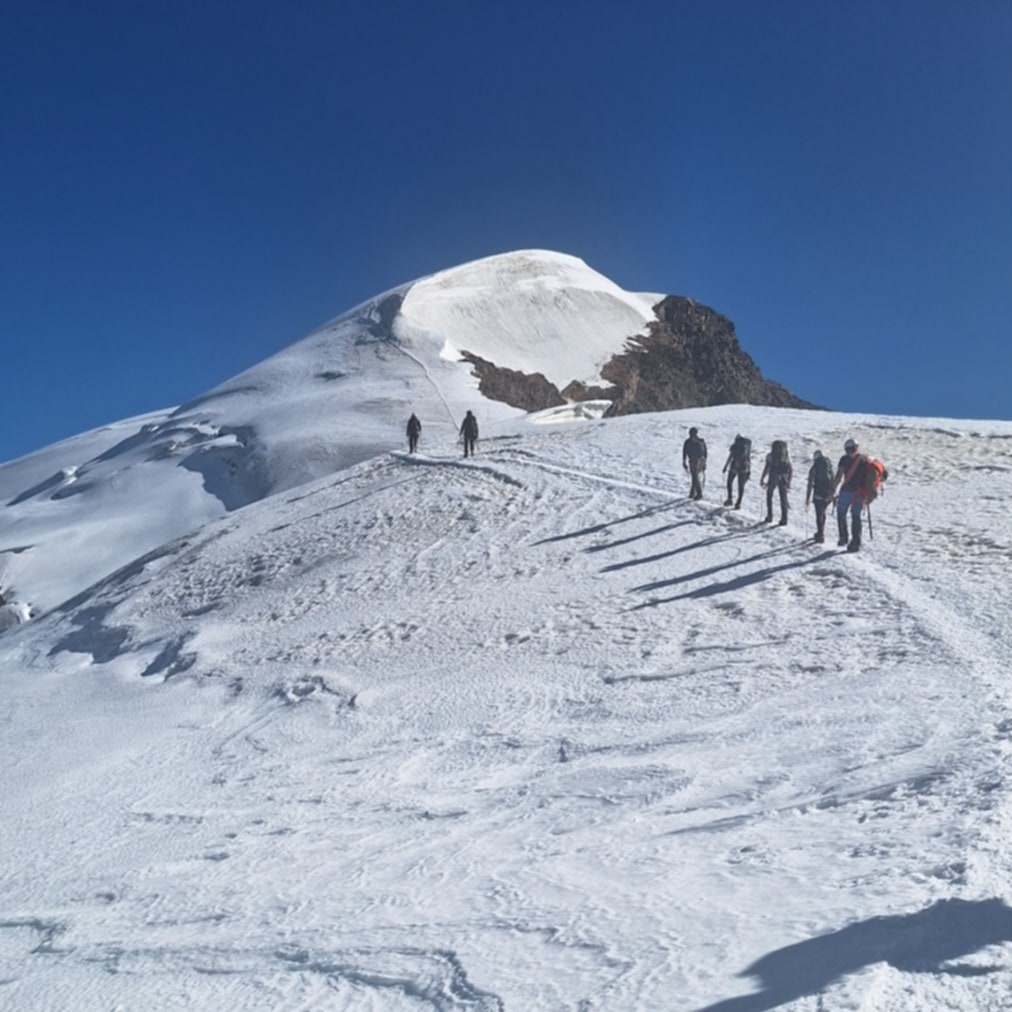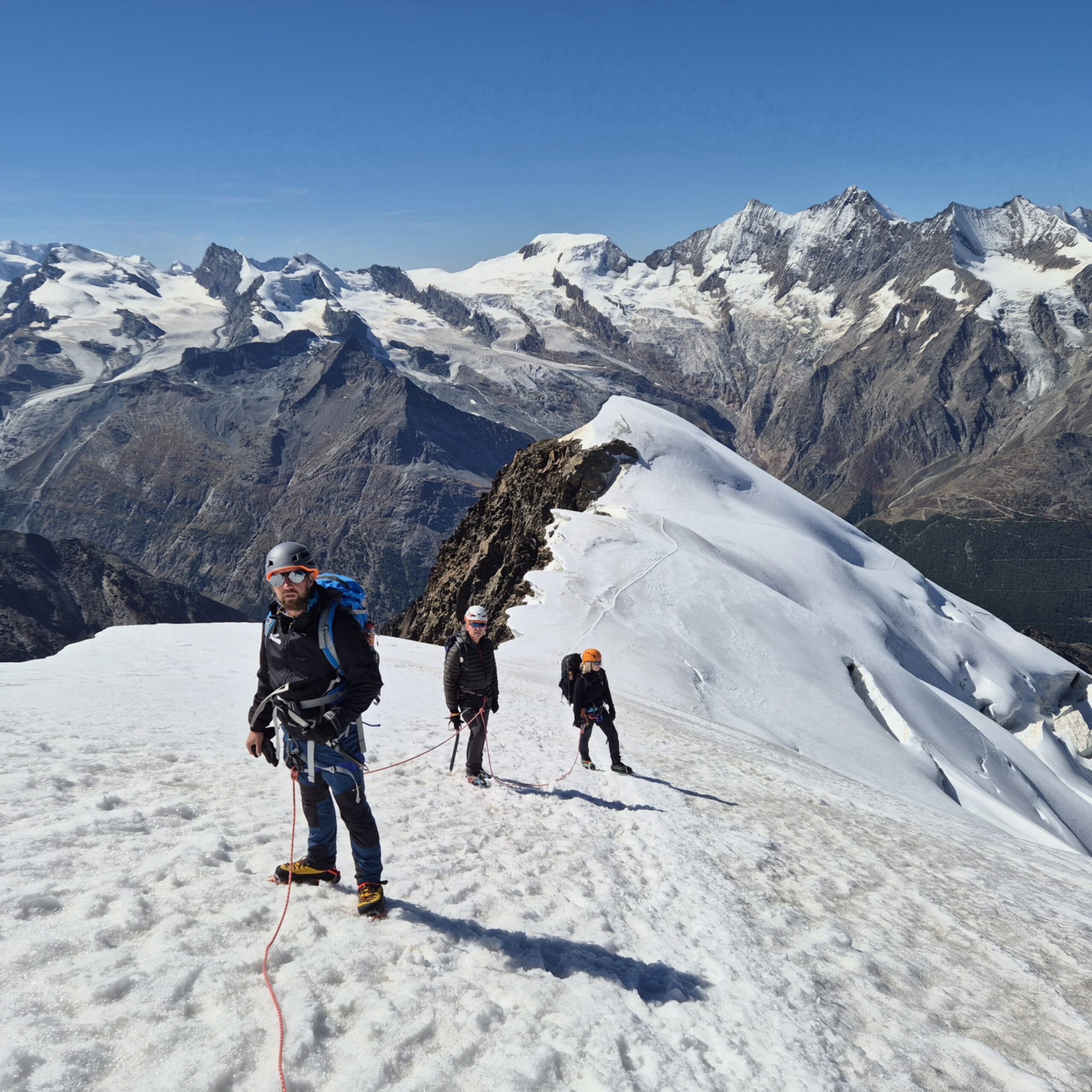 Pri koči smo prikazali in povadili ledeniško navezo in reševanje iz ledeniške razpoke. Potem smo med vzponom na Piramide Vincent (4215 m) še v praksi izvajali gibanje ledeniške naveze in premagovanje ledeniških razpok ter se po kratkem počitku na vrhu vrnili nazaj do koče.